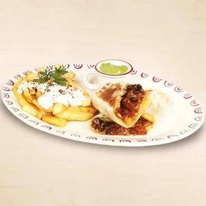 Burrito de cerdo en salsa pasilla con arroz, frijoles de la olla y queso manchego, acompañado de papas a la francesa con aderezo de perejil y tocino.